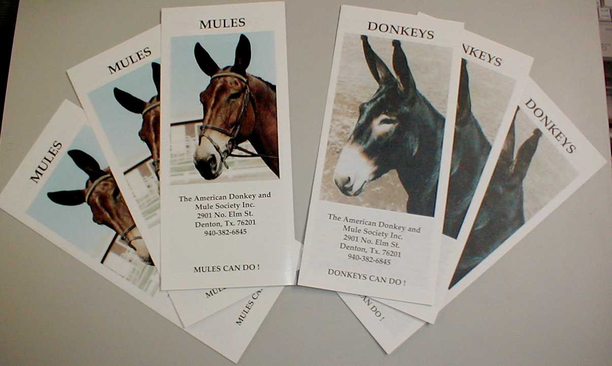 | Our newest color brochure - perfect for school presentations, for 4-H projects, or as a backer on your booth. One free with each membership, or a bundle of 50 for $10.00 Free flyers about our books, or general overview of the ADMS and our services. We can send 10 to 500, and you are also welcome to ask for an original to make as many copies of this type of flyer as you like. We usually print on mixed pastel or bright colors. 3-fold color Donkey or Mule brochures. Brief overview about Donkeys and mules, photos, terminology. Excellent for projects or at expositions. One of each free to each member, additional copies 20 cents each, 10 for $2.00 25 for $4.00, 50 for $9.00. Be sure to state whether you wish to have the Donkey or Mule or both. Flyers of the Clipart collections, also flyers of "photo Sheets" and other general flyers available. Please be sure to contact us well in advance of your event so we can have time to deliver via the Post Office. Feel free to e-mail your requests or questions at any time! |