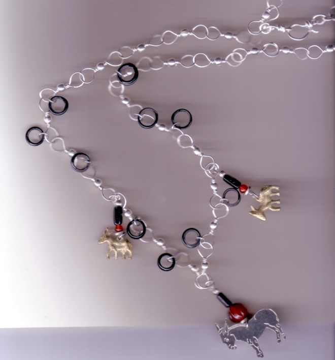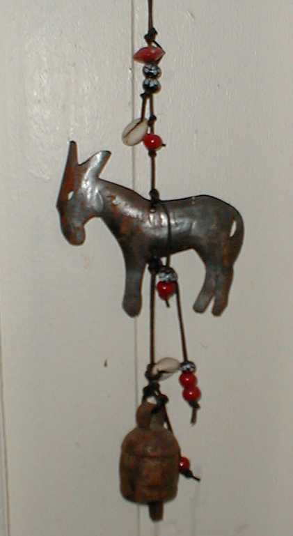 Shipping for A, B or C $1.00 first, $.50 each additional. Bell Hanging - Iron Donkey, beads, creamyshells, and melodic brass bell. $8.00, $3.00 shipping. Silver chain necklace. One silver donkey that matches the Pin and Earrings (same donkey as the one to left) and two smaller brass/goldtone ones. $12.00 each. Shipping $2.00.