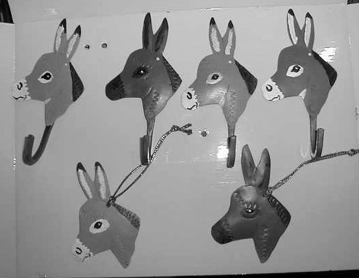 As a wall hook - single sturdy hook welded to the bottom of the neck. Use int he house for hats, keys or the like, or in your stable as halter hooks. Perfect gift items - stocking stuffers, or barn ornaments! Wall Hook - Unpainted or flat black $7.00. Painted, $10.00